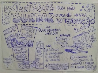 Desde minha entrada na UPA até o retorno à vida (ALTA). São tirinhas, HQs e cartuns que contam de um tudo. Exames, medicamentos, dor, reflexões, comida, mais medicamentos e até os bichinhos da COVID aparecem -- como personagens folgados e maquiavélicos. Em várias situações, me coloquei conversando com eles sobre conspirações, epidemia, raça humana, contágio e muitas outras coisas...